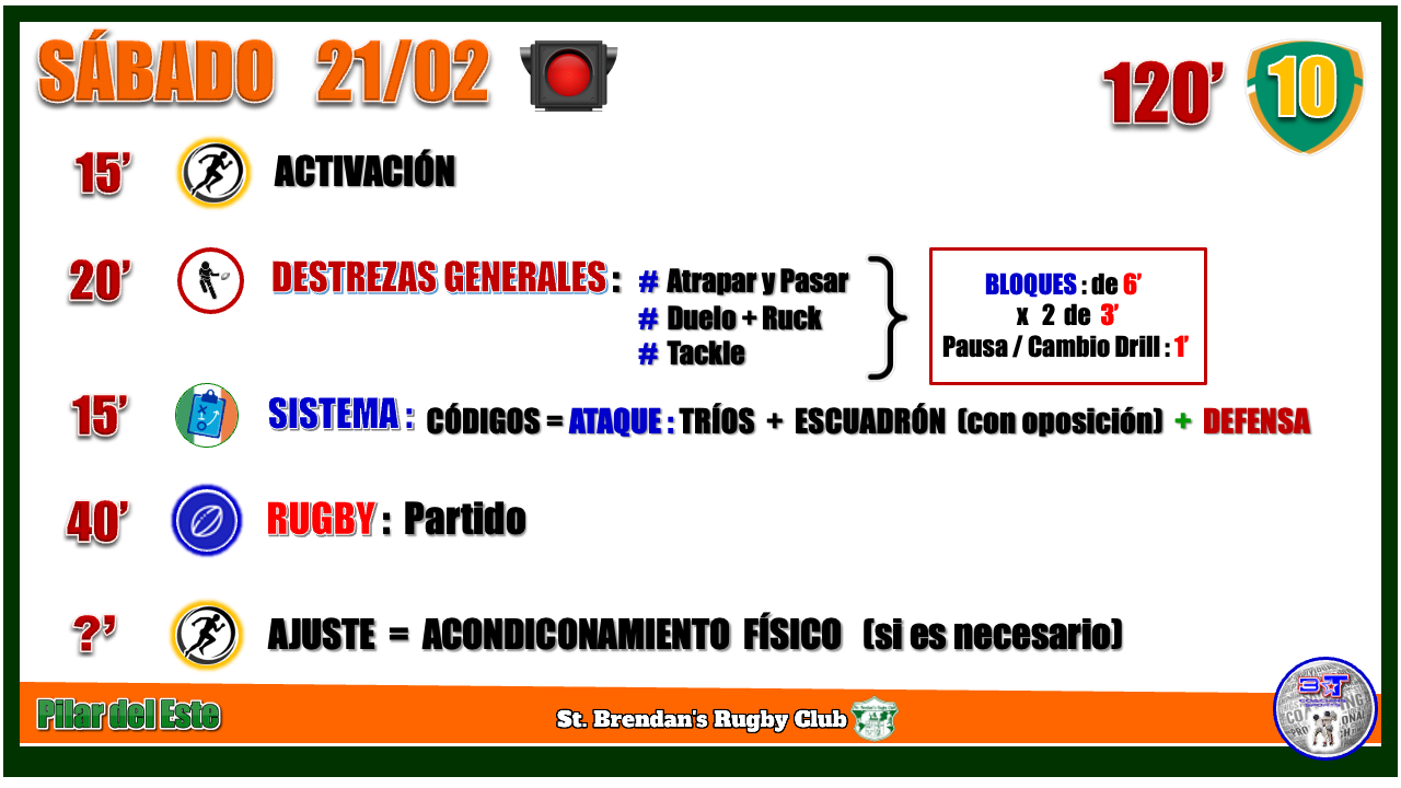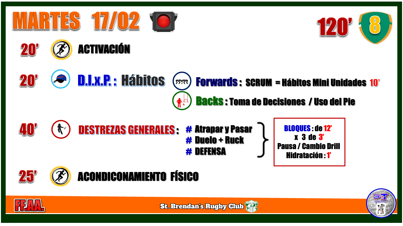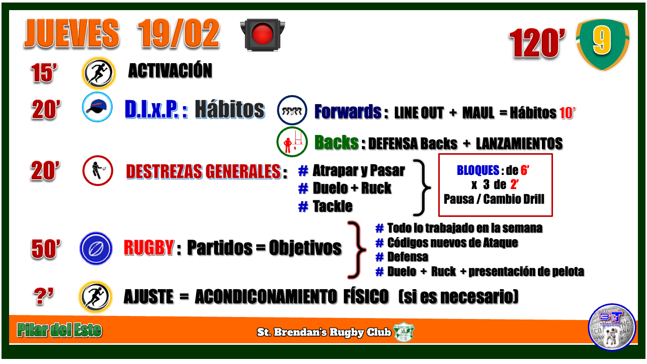 Activación 15' Destrezas por puestos 20' Destrezas generales 20' Rugby 50' Acondicionamiento - si es necesario Destrezas por puestos: Backs: Lanzamientos + defensa Fowards: lineout Destrezas generales: Atrapar y pasar/ Duelo + ruck / tackle Rugby objetivos: Aplicar todo lo trabajado en la semana: códigos, destrezas y roles defensivos